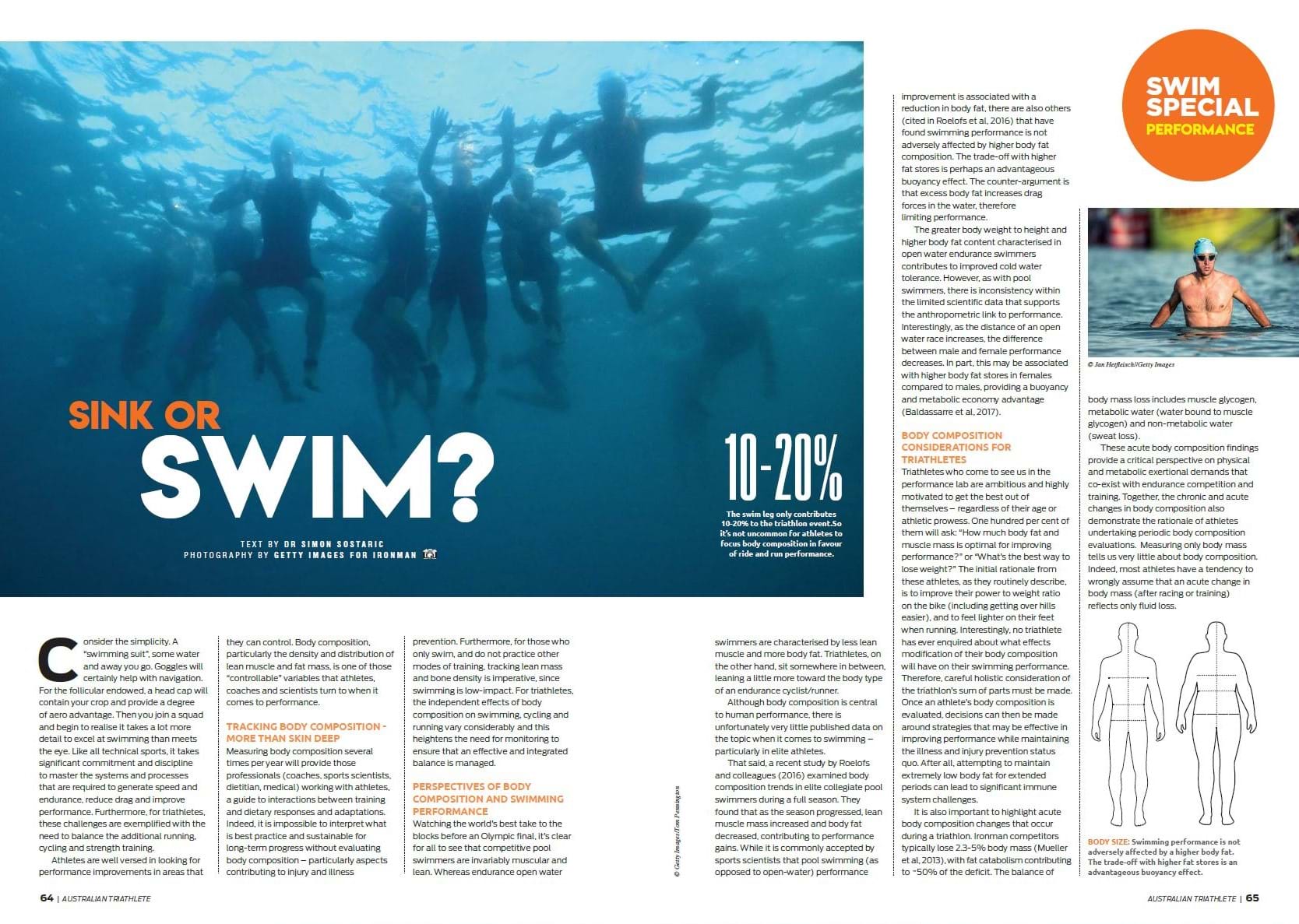 The pro's and con's of altering body composition on swimming performance is discussed by Dr Simon Sostaric, in the January 2018 edition of the Australian Triathlete Magazine.